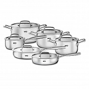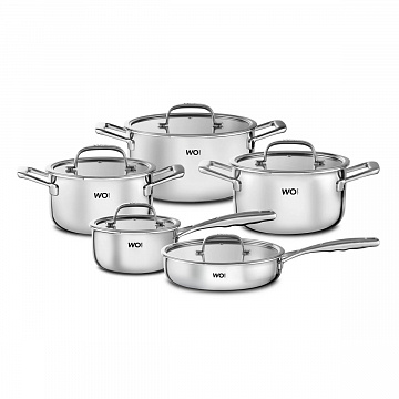 Идеальное сочетание дизайна и функциональности: набор трех кастрюль, ковша и сковороды WO HOME Verona из нержавеющей стали 18/10 с трехслойным дном для равномерного распределения тепла, эргономичными прохладными ручками и совместимостью с индукционными плитами. Подходит для духовки до 240°C и легко моется в посудомоечной машине.