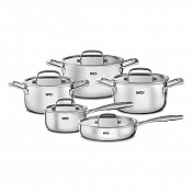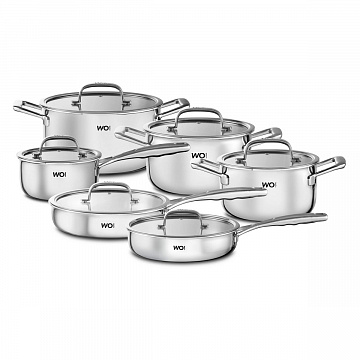 Идеальное сочетание дизайна и функциональности: набор трех кастрюль, ковша и двух сковородок WO HOME Verona из нержавеющей стали 18/10 с трехслойным дном для равномерного распределения тепла, эргономичными прохладными ручками и совместимостью с индукционными плитами. Подходит для духовки до 240°C и легко моется в посудомоечной машине.