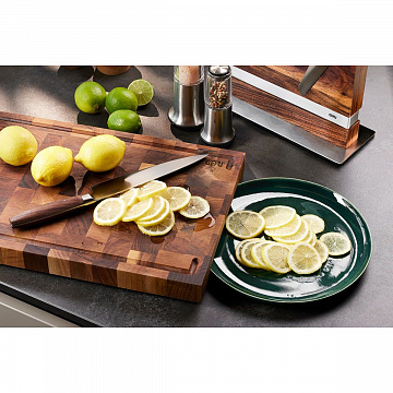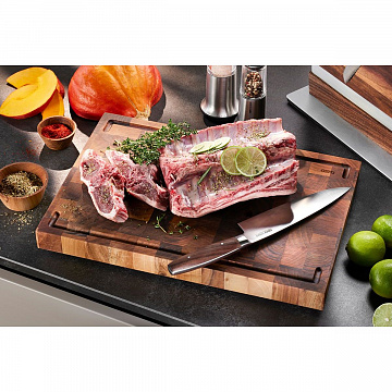 Режьте и рубите как профессионал. ENNO изготовлен из богатой, прочной древесины ореха, что придает каждой колоде индивидуальный и высококачественный вид. Благодаря высококачественной обработке отборной древесины с торцевым волокном, он особенно прочен и обеспечивает прочную и устойчивую основу для рубки и нарезки всех видов продуктов, не повреждая при этом высококачественные лезвия. Особо прочный материал из ценной древесины европейского ореха толщиной 4 см. Исключительная несущая способность благодаря торцевой структуре древесины: древесные волокна перпендикулярны нагрузке и поэтому прочнее. Непрерывная канавка для сбора сока. Режущая поверхность щадящая лезвия. Антибактериальный эффект. Противоскользящие ножки.