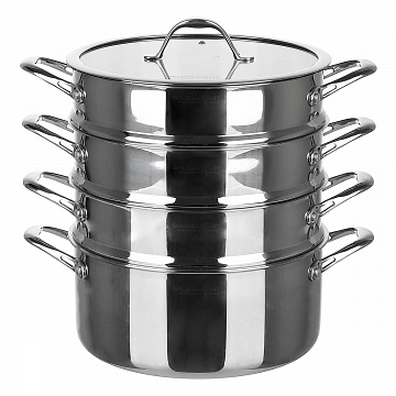 Пароварка AVELINO 28х13см/7,8 л с тремя пароварочными отделениями 28х8см со стеклянной крышкой. Трехслойный корпус, толщина 2,5мм, литое индукционное дно. Материал: нержавеющая сталь 18/10. Толщина: 2,5мм. Полирование: зеркальное.
