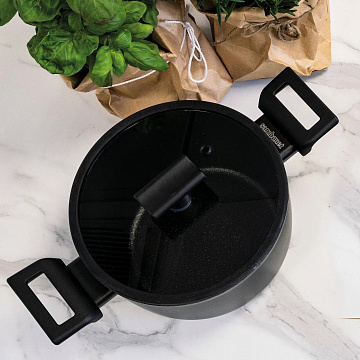 Премиум-линия высочайшего качества. 100% сделано в Италии. Начинка остается в центре, что способствует равномерному приготовлению. Готовьте более здоровую пищу, добавляя меньше масла и жира. В 4 раза сильнее конкурентов на рынке. Устойчив к пятнам, царапинам и воздействию натуральных пищевых кислот. Титановый слой, армирование и отделка алмазным порошком и минеральными частицами высокой твердости. Двойная индукция: два диска из нержавеющей стали окружают алюминиевый корпус. Не расширяется и не деформируется при нагревании. Сверхплоское дно устойчиво на плите, нагревается без рассеивания тепла. Высокая вместимость благодаря углу варочной поверхности и изысканному минималистичному дизайну. Алюминиевый корпус, бакелитовые ручки, стеклянные крышки с отверстием для выхода пара и силиконовым ободом.