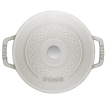 Приготовление в кокоте – это, пожалуй, самый простой способ превратить свежие ингредиенты во вкусное блюдо с французским привкусом. Просто поставьте кокот на плиту (можно также на индукционную), разогрейте в ней немного сливочного или растительного масла и обжарьте мясо несколько минут. Затем добавьте овощи по желанию, закройте крышку с системой самоорошения и поставьте кокот в духовку. Теперь у вас есть время расслабиться или посвятить себя гостям, пока кокот делает свою работу. Когда мясо будет готово, вы даже можете подать блюдо прямо в кокоте, где оно долгое время будет сохранять идеальную температуру. Этот круглый кокот диаметром 24 см и объемом 4,25 л идеально подойдет как для повседневного приготовления пищи на семью, так и для приготовления основного блюда на празднике. Он изготовлен из чугуна и имеет эмалированное покрытие. Матово-черная внутренняя часть обладает превосходными кулинарными свойствами, а внешнее покрытие цвета «Белый трюфель» делает кокот привлекательным визуально. Сочетание материалов обеспечивает равномерное распределение тепла, а крышка сконструирована таким образом, чтобы конденсат стекал обратно на блюдо. В результате получается сочное мясо и нежные овощи с прекрасно сохранившимися ароматами и насыщенным соусом.