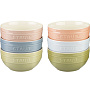 Этот набор керамических мисок в шести пастельных тонах, вы можете использовать в течение всего дня. Их можно использовать для хлопьев, салатов или обедов, а также для десертов и мороженого. Набор из 6 мисок, диаметром 14 см, светло-розового, розового, светло-голубого, синего, светло-зеленого и зеленого цвета глазури. Их можно мыть в посудомоечной машине, а также использовать в микроволновой печи и духовке.