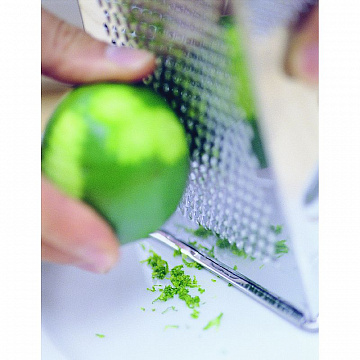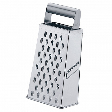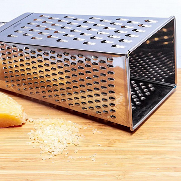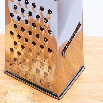Терка имеет четыре стороны для измельчения продуктов: мелкая, крупная терки, терка для нарезки ломтиками и рефлеными ломтиками. Терка ломтиками оснащена двухсторонним лезвием для удобства нарезки в обоих направлениях. Удобная металлическая ручка. Может использоваться для мелкой, крупной тёрки и для тёрки картофеля.