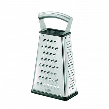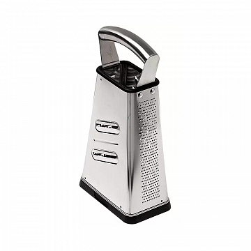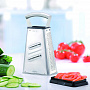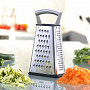 Благодаря специальной технологии лазерной заточки, терка имеет очень острые лезвия, которые которые гарантируют превосходный результат. Основание, выполненное из специального пластика, не скользит и не царапает посуду. Имеет контейнер для сбора натертых продуктов. Металлическая ручка обеспечивает удобный хват при использовании. Четыре стороны терки VITALES обеспечивают нарезку разными способами: слайсер ломтиками, крупная терка, мелкая терка, терка для крошки.