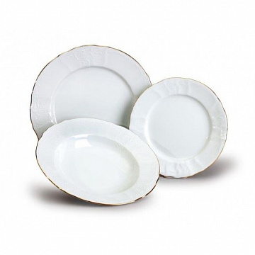 В комплект тарелок на 6 персон входит: 6 тарелок неглубоких - 25 см; 6 тарелок глубоких - 23 см; 6 тарелок десертных - 19 см. Вес упаковки: 7,4 кг. Дизайн с тонкой золотой рамкой переводит эту коллекцию в группу TOP Elegance. Не подходит для использования в микроволновой печи и посудомоечной машине.
