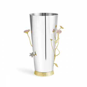 Ваза для цветов Michael Aram из коллекции "Wildflowers" представляет собой эксклюзивную дизайнерскую модель для ценителей элитного декора. Эта металлическая ваза изготовлена из нержавеющей стали с серебряным финишем и украшена объемными цветами с покрытием позолота, дополненными яркой цветной эмалью. Каждое изделие является ручной работой, что подчеркивает его коллекционную ценность и премиум-статус.