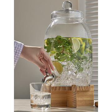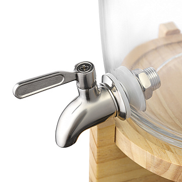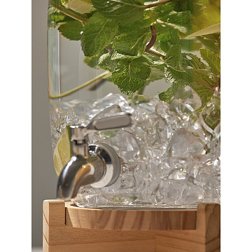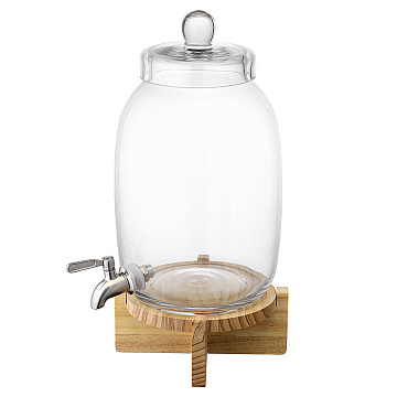 Диспенсер на деревянной подставке Flo – прекрасное решение для кухни или бара. Этот стильный и удобный в использовании аксессуар станет изюминкой любой сервировки и облегчит процесс подачи напитков гостям. Он отлично подойдет для морса, лимонада, кваса, сока и других холодных напитков. Особенности и преимущества: Емкость выполнена из боросиликатного стекла, известного своей высокой прочностью и долговечностью; Для хорошей устойчивости предусмотрена подставка из древесины сосны, которая также добавляет дизайну изюминку; При объеме 5,4 л диспенсер имеет компактные размеры, благодаря чему не занимает много места; Удобная конструкция с краником позволяет легко наполнять стаканы или бокалы напитками, исключая их проливание.
