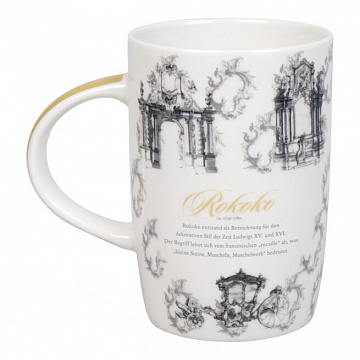 Эта чашка — шедевр стиля рококо — дань уважения богатой эпохе 18 века! С тонкими иллюстрациями роскошных украшений и архитектурных элементов она переносит зрителя в мир элегантности и богатой детализации. Золотые буквы рококо и декоративный орнамент на внутренней стороне придают кружке королевский оттенок. Идеально подходит для любителей классического искусства и эстетики, которые хотят наслаждаться кофе или чаем со стилем. Эта кружка Basic Bone — больше, чем просто сосуд для питья — это заявление об утонченном вкусе и историческом очаровании.