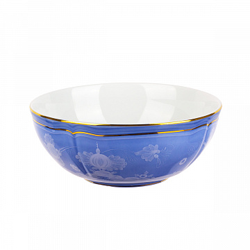 Историческая форма Antico Doccia украшена синим барвинком, среди которого выделяется знаменитая гарофано (гвоздика) тон в тон. Золотая нить украшает весь предмет. Простой и универсальный, он подходит для любого момента за столом, будь то сервировка основных блюд или подача приправ и соусов в эклектичной и красочной обстановке. Oriente Italiano, представленный в полных наборах для сервировки стола, чая, кофе и предметов домашнего декора, является воплощением итальянского мастерства и волшебства, создавая волшебную атмосферу Востока в неповторимом стиле Ginori 1735.