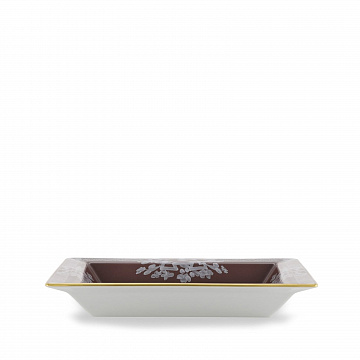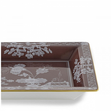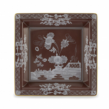 Большой квадратный фарфоровый поднос с декором Castagna и золотой нитью. Коллекция Oriente Italiano. Благодаря своему ненавязчивому, но изысканному присутствию, большой квадратный фарфоровый поднос из коллекции Oriente Italiano Castagna украсит любое пространство универсальностью и элегантностью. Востребованный коричневый оттенок Castagna и нежная золотая нить делают его элементом домашнего декора, который идеально вписывается как в классические, так и в современные интерьеры. Поставьте его у входа в дом: он будет встречать гостей стильно, предоставляя элегантное место для хранения ключей, монет и мелких повседневных вещей. На вашем столе он станет изысканным подносом для рабочих безделушек, способствуя более упорядоченной и изысканной обстановке. Этот дизайнерский поднос для мелочей также идеально подходит для подачи закусок. Этот дизайнерский поднос для мелочей, представленный в эксклюзивной роскошной коробке , также идеально подходит для празднования особого случая или для того, чтобы удивить любимых людей. Его непременно оценят по достоинству за его способность сочетать элегантность и функциональность. Изделия из фарфора Oriente Italiano, изготовленные с мастерством, которое всегда отличало флорентийскую мануфактуру, превращают каждый предмет в произведение искусства, достойное высокой оценки.