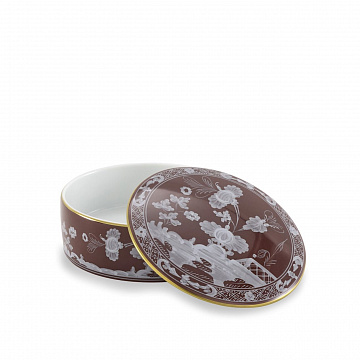 Фарфоровая шкатулка для безделушек с декором Castagna и золотой нитью. Коллекция Oriente Italiano. Теплый и обволакивающий коричневый оттенок Castagna украшен белыми узорами и золотой нитью в этой фарфоровой шкатулке для безделушек с изысканным дизайном. Помещенный на стол или в прихожую, он становится изысканным контейнером для небольших повседневных аксессуаров. Он также идеально подходит для хранения ювелирных изделий и ценностей в спальне или как изысканное решение для декора в профессиональных помещениях. Для тех, кто любит быть смелым, этот дизайнерский объект также может найти применение на столе: как солонка, сахарница, для подачи небольших блюд или изысканных закусок. Эта закрытая шкатулка для безделушек, упакованная в элегантную роскошную коробку , превращается в ценный подарок, идеально подходящий для свадеб, юбилеев или значимых торжеств. Вдохновитесь цветочными мотивами и яркими оттенками Oriente Italiano , которые стимулируют безграничное творчество, позволяя вам создавать уникальные и индивидуальные комбинации.