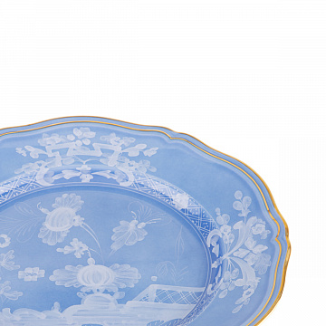 Фарфоровая плоская тарелка с синим декором. Коллекция Oriente Italiano. Плоская тарелка изготовлена из тонкого фарфора с изысканной золотой нитью. Antico Doccia, историческая икона флорентийского производителя, придает гармоничные и утонченные линии, барвинковый синий оживляет дизайн, а знаменитый цветочный мотив «гвоздика» тон в тон придает подлинную оригинальность. Oriente Italiano — это дань уважения волшебной восточной атмосфере, воссозданной благодаря мастерству и заботе мастеров Ginori 1735.