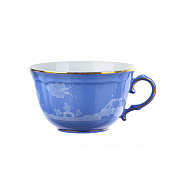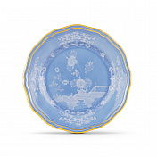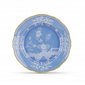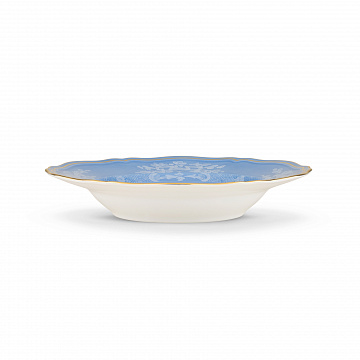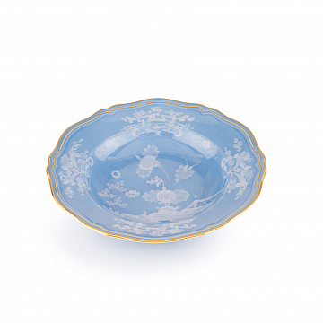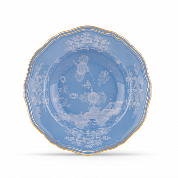Фарфоровая суповая тарелка с декором в барвинково-голубых тонах и золотой нитью. Коллекция Oriente Italiano. Суповая тарелка изготовлена из тонкого фарфора, украшенного декором цвета барвинка и цветочным мотивом тон в тон. Отличительная нить из чистого золота определяет линии дизайна в форме Antico Doccia, классической иконы флорентийского производства.
