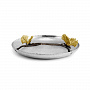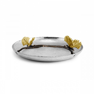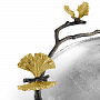 Круглое блюдо Michael Aram из коллекции «Butterfly Ginkgo» — это элегантный предмет дизайнерской посуды, сочетающий современный минимализм и природную символику. Основа выполнена из нержавеющей стали серебристого цвета, а главное украшение — изящная ветвь гинкго с золотыми бабочками из латуни. Диаметр блюда составляет 21 см, общие габариты — 23,5×21×5 см.