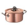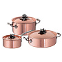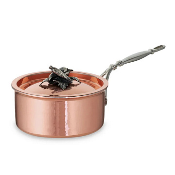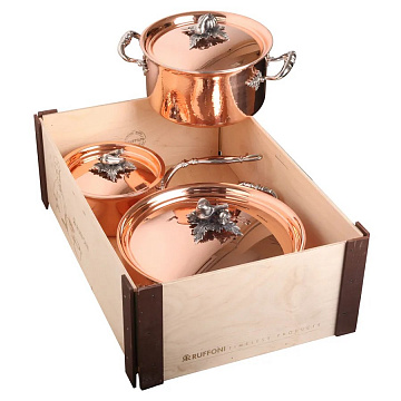 Набор посуды Opus Cupra итальянского бренда Ruffoni состоит из трех экземпляров. Посуда произведена из меди, а внутренний слой выполнен из нержавеющей стали. Сочетание металлов делает кухонную утварь прочной, износостойкой и долговечной. Изделия не поддаются деформации и на протяжении всего срока службы сохраняют эстетически привлекательный внешний вид. В комплект входят сотейник объемом 5 л, кастрюля на 3,5 л и ковш емкостью 1,5 л. Посуда обладает максимальной функциональностью. Имея этот набор, каждая хозяйка сможет приготовить самые разнообразные блюда: от мясных деликатесов до сладких десертов. Настоящим украшением посуды являются ручки и крышки, оснащенные изящными скульптурными композициями.