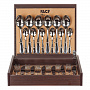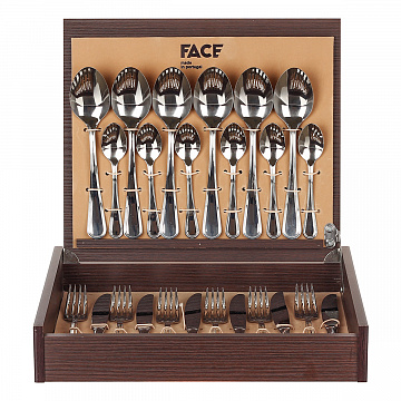Утонченные столовые приборы Face не деформируются, не подвергаются коррозии, не изменяют вкусовые свойства, запах и цвет пищи. Они производятся в Португалии под жестким контролем качества. Металл, используемый для создания столовых приборов бренда Face, – нержавеющая сталь. В материале содержится 18 % хрома и 10 % никеля. Такое процентное соотношение химических элементов обеспечивает достаточную прочность готовых изделий. Столовые приборы Face выполнены по уникальному дизайну и оформлены в красивые подарочные упаковки. Стильные изделия можно смело использовать для сервировки праздничного стола. В состав набора входит: ложка столовая - 6 шт., ложка чайная - 6 шт., вилка столовая - 6 шт., нож столовый - 6 шт.