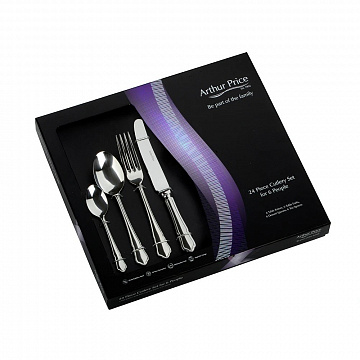 Набор из 24 предметов Everyday Classic Dubarry в коробке. Включает: 6 столовых ножей, 6 столовых вилок, 6 десертных ложек и 6 чайных ложек. Подробности - нержавеющая сталь 18/10, можно мыть в посудомоечной машине