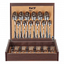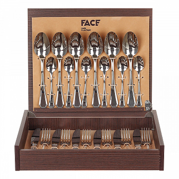 Утонченные столовые приборы Face не деформируются, не подвергаются коррозии, не изменяют вкусовые свойства, запах и цвет пищи. Они производятся в Португалии под жестким контролем качества. Металл, используемый для создания столовых приборов бренда Face, – нержавеющая сталь. В материале содержится 18 % хрома и 10 % никеля. Такое процентное соотношение химических элементов обеспечивает достаточную прочность готовых изделий. Столовые приборы Face выполнены по уникальному дизайну и оформлены в красивые подарочные упаковки. Стильные изделия можно смело использовать для сервировки праздничного стола. В состав набора входит: ложка столовая - 6 шт., ложка чайная - 6 шт., вилка столовая - 6 шт., нож столовый - 6 шт.