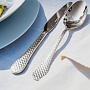 Полировка с зеркальным эффектом лучше всего подчеркивает высокое качество нержавеющей стали, подчеркивая форму и дизайн. Поверхности полируются с помощью присадок и механических щеток из различных зерен и материалов, которые придают нержавеющей стали блеск. Объект обогащен отражениями, которые делают его еще более ценным. Цельный нож изготовлен из цельного куска стали. В отличие от ножа с полой рукояткой, состоящей из двух частей, здесь нет перемычек между рукояткой и лезвием и, держа в руках эти виды ножей, испытываешь приятное ощущение тяжести и солидности. Последовательность геометрических орнаментов, напоминающих византийское и сицилийское искусство, украшение, которое в своем мотиве сохраняет художественное богатство разнообразного культурного наследия жемчужины Средиземноморья: Таормины. Состав набора: 6 столовых ложек, 6 столовых вилок, 6 столовых ножей, 6 чайных ложек.