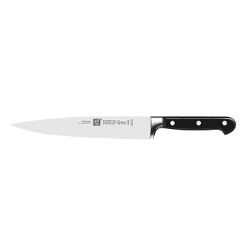 Измельчение больших кусков мяса - одна из самых сложных задач, с которой Вы можете столкнуться в процессе приготовления блюда, особенно когда в мясе есть фрагменты костей. Но специальный нож для нарезки значительно упрощает удаление костей и измельчение мяса. Вот почему и профессиональные повара, и амбициозные любители готовки выбирают серию PROFESSIONAL "S" от ZWILLING. Изготовленные из цельного куска стали и снабженные надежными заклепками, скрепляющими хвостовик и рукоятку, ножи этой серии известны своей исключительной прочностью. Эти ножи выкованы с высокой точностью, и благодаря плавному переходу между больстером и рукоятью нож чрезвычайно удобен в обращении. Мясо - ключевой ингредиент множества вкусных блюд: сытное жаркое или сочный стейк - всегда долгожданное угощение! Суп или соус также можно улучшить, добавив несколько отборных кусков мяса, которое во время приготовления выделяет сок и придает блюду характерный аромат. Вы можете использовать нож для нарезки, чтобы нарезать большие куски мяса на более мелкие с минимальными усилиями. Лезвие длиной 20 см может точно и без усилий разрезать сухожилия, что позволяет придать мясу более удобную форму или разрезать его на более мелкие куски. С помощью ножа для нарезки ZWILLING Вы можете создавать вкуснейшие блюда, которые обязательно понравятся Вашим друзьям и родным. Нож применяется для резки твердых и мягких продуктов (овощи, фрукты, мясо). Изготовлен из высококачественной нержавеющей стали, рукоятка покрыта пластиком. Нож SIGMAFORGE выкован из цельного куска твердой стали. Лезвие FRIODUR обладает прекрасными режущими свойствами, отличаются особой прочностью, стойкостью к коррозии и гибкостью. Дизайн рукоятки с 3 заклепками и открытым хвостовиком обеспечивает оптимальный баланс. Рукоятка эргономичной формы гарантирует защиту и дополнительную безопасность во время резки, а также равномерное распределение веса. Режущая кромка, заточенная под углом приблизительно 30° (15° с каждой стороны), гарантирует высокую производительность резки для удовлетворения самых взыскательных требований. Шейка образует переход от рукоятки ножа к лезвию. Она выполнена как предохранитель пальцев и обеспечивает не только безопасность, но и правильное распределение массы. Использование и уход: нож мыть теплой водой с применением жидкого моющего средства, вытирать насухо. Смывать кислоты после резки овощей и фруктов сразу после использования. Использовать специальную разделочную поверхность (деревянную или пластиковую). Использовать только по назначению! Не использовать в качестве открывалки или отвертки, не резать замороженные продукты, не ронять на пол, не класть на горячие конфорки и иные источники интенсивного тепла. Хранить в недоступном для детей месте.