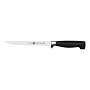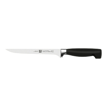 Филейный нож ZWILLING Four Star позволяет легко отделять мясо и рыбу от костей. Изысканный дизайн разделочного ножа удачно сочетается с любыми кухонными принадлежностями и обеспечивает приятную работу. Нож SIGMAFORGE выкован из цельного куска стали, что делает его особенно прочным и упругим. Это главным образом обусловливает отличные режущие свойства ножа. Для изготовления лезвия используется нержавеющая сталь специальной формулы ZWILLING, которая отличается оптимальным содержанием хрома и углерода. Лезвие также подвергается дополнительному процессу ледяной закалки, что обеспечивает исключительную коррозионную стойкость. Кроме того, лезвие FRIDOUR остается острым и гибким, а также дольше сохраняет структуру режущей кромки. 18-сантиметровое лезвие ножа плавно переходит в больстер и рукоять, исключая колкие выступы. Больстер обеспечивает правильный весовой баланс между лезвием и ручкой, гарантируя комфортное и, прежде всего, безопасное обращение с ножом во время использования. Применяется для вырезки мясного и рыбного филе, разделки сырого и готового мяса и рыбы. Нож изготовлен из высококачественной нержавеющей стали, рукоятка покрыта пластиком. Качество ножа марки FRIODUR повышается в процессе низкотемпературной закалки. Лезвие ножа обладает прекрасными режущими свойствами, отличается особой прочностью, стойкостью к коррозии и гибкостью. Шейка образует переход от рукоятки ножа к лезвию. Она выполнена как предохранитель пальцев и обеспечивает не только безопасность, но и правильное распределение массы. Режущая кромка, заточенная под углом приблизительно 30° (15° с каждой стороны), гарантирует высокую производительность резки для удовлетворения самых взыскательных требований. Рукоятка из синтетического материала имеет удобную закругленную форму и хорошо сбалансирована. Такая форма рукоятки идеально подходит для резки. Мыть теплой водой с применением жидкого моющего средства, вытирать насухо. Смывать кислоты после резки овощей и фруктов сразу после использования. Использовать специальную разделочную поверхность (деревянную или пластиковую). Использовать только по назначению! Не использовать в качестве открывалки или отвертки, не ронять на пол, не класть на горячие конфорки и иные источники интенсивного тепла, не резать замороженные продукты. Хранить в недоступном для детей месте.