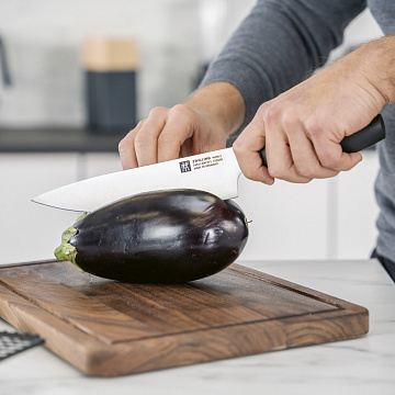 На что только способен этот нож! Например, он может нарезать мясо и птицу, нарезать овощи и фрукты, нарезать кубиками лук и чеснок, а также мелко нарезать имбирь и зелень. Этот поварской нож серии ZWILLING NOW S помогает даже новичкам справляться с задачами на кухне наравне с профессионалами после небольшой практики. Закаленное лезвие FRIODUR длиной 20 см является универсальным и настолько острым, что процесс резки осуществляется почти без усилий. Этот простой в уходе поварской нож изготовлен в Германии из специальной нержавеющей стали ZWILLING по особой формуле, чтобы он долго сохранял свою режущую кромку острой. Благодаря эргономичной нескользящей ручке, он удобно лежит в руке даже при длительном использовании. Современный и динамичный концептуальный дизайн был создан миланской командой дизайнеров Маттео Туном и Антонио Родригесом. Природа подсказала современный цвет этого ножа, который не подвластен времени и подходит к любому стилю и интерьеру: темные ягоды, шоколад и баклажаны являются источниками вдохновения для этого ненавязчивого классического черного цвета. Мыть теплой водой с применением жидкого моющего средства, вытирать насухо. Смывать кислоты после резки овощей и фруктов сразу после использования. Использовать специальную разделочную поверхность (деревянную или пластиковую). Использовать только по назначению! Не использовать в качестве открывалки или отвертки, не ронять на пол, не класть на горячие конфорки и иные источники интенсивного тепла, не резать замороженные продукты. Хранить в недоступном для детей месте.