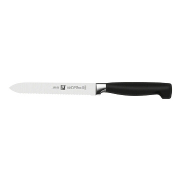 Этот универсальный нож из серии FOUR STAR впечатляет своим испытанным временем классическим дизайном. Нож среднего размера с лезвием 13 см отличается эргономичностью и удобством использования. Благодаря зубчатому лезвию нож может использоваться как универсальный инструмент на кухне, который идеально подходит для нарезки колбасы, сыра и помидоров на небольшие ломтики. Специальная сталь, используемая для ножа, - нержавеющая. Благодаря этому универсальный нож легко мыть, он очень прочный и долговечный. Лезвие FRIODUR подвергается специальной обработке ледяной закалкой. Этот процесс делает режущую кромку особенно острой, устойчивой к коррозии и гибкой. Плавный переход от больстера к рукоятке облегчает обращение с ножом. Нож SIGMAFORGE выкован из цельного куска стали, что обеспечивает хорошую геометрию и режущие свойства. Больстер обеспечивает правильный баланс. В то же время он защищает пальцы, сводя к минимуму скольжение руки с рукоятки на лезвие. Применяется для нарезки мягких продуктов с жесткой кожей (томаты, фрукты, колбаса, хлеб). Нож изготовлен из высококачественной нержавеющей стали, рукоятка покрыта пластиком. Качество ножа марки FRIODUR повышается в процессе низкотемпературной закалки. Лезвие ножа обладает прекрасными режущими свойствами, отличается особой прочностью, стойкостью к коррозии и гибкостью. Режущая кромка, заточенная под углом приблизительно 30° (15° с каждой стороны), гарантирует высокую производительность резки для удовлетворения самых взыскательных требований. Мыть теплой водой с применением жидкого моющего средства, вытирать насухо. Смывать кислоты после резки овощей и фруктов сразу после использования. Использовать специальную разделочную поверхность (деревянную или пластиковую). Использовать только по назначению! Не использовать в качестве открывалки или отвертки, не ронять на пол, не класть на горячие конфорки и иные источники интенсивного тепла, не резать замороженные продукты. Хранить в недоступном для детей месте.