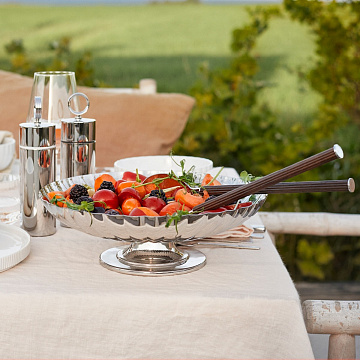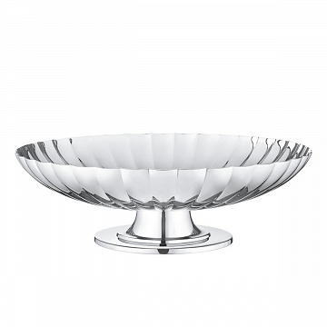 Вдохновленная культовой работой Сигварда Бернадотта, команда дизайнеров Georg Jensen создала это элегантное блюдо на подставке. Отличительная черта Бернадотта теперь расходится по всему блюду, а сама подставка взята из одного из его оригинальных дизайнов подсвечников. Она прекрасно смотрится в качестве центрального элемента на столе, возможно, для фруктов или хлеба. Родившийся в шведской королевской семье, Сигвард Бернадот был одним из самых ранних сотрудников Георга Йенсена. Его любовь как к изысканной эстетике, так и к строгой функциональности делает его ключевой фигурой в истории скандинавского дизайна, а его коллекция Bernadotte оказалась вне времени. Искусно изготовленная из нержавеющей стали тарелка имеет блестящую зеркально-полированную поверхность, подчеркивающую элегантность рифленой поверхности.