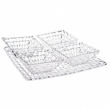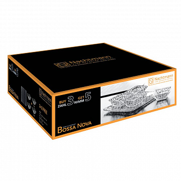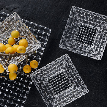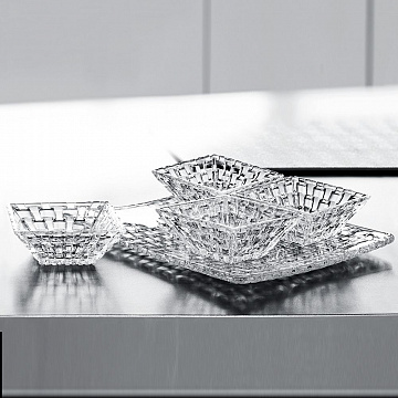 Набор салатников на блюде понравится ценителям изящных линий и будет прекрасным украшением праздничного стола. Коллекция посуды Bossa Nova имеет неповторимый дизайн из причудливых кристаллов в форме квадратов, создающих плетеный орнамент и отвечает самым высоким требованиям. Как и все изделия Nachtmann, отличается долговечностью, высокой устойчивостью к царапинам и сколам. Можно мыть в посудомоечной машине.