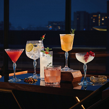 Модель D.O.F. имеет основание, украшенное декором в виде бриллианта, и стенки с крупным гранением. Эти стаканы ёмкостью 370 мл подойдут для подачи как безалкогольных, так и спиртных напитков, и станут прекрасным дополнением и для уютного семейного стола, и для громкой ночной вечеринки.
