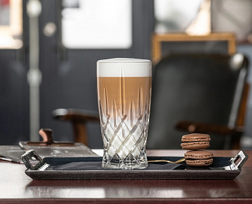 Большой стакан для латте макиато / холодного кофе прекрасно демонстрирует содержимое и его нежные, насыщенные цвета, а также подчёркивает привлекательный гранёный край.