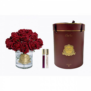 Каждый реалистичный ароматный букет роскошных больших розовых бутонов искусно изготовлен вручную и заключен в гель, придающий ему вид воды. Каждый лепесток покрыт специальным натуральным покрытием, что придает им реалистичный вид и текстуру. Двадцать один розовый бутон размещен в стеклянной вазе ручной работы с золотым фирменным знаком Cote Noire.
